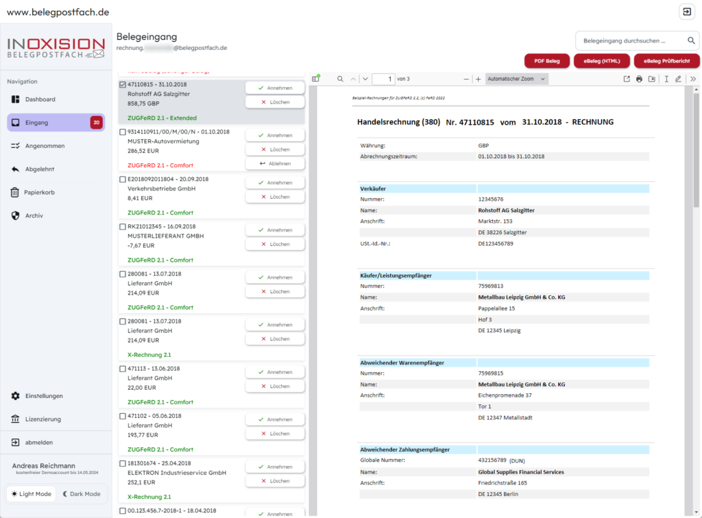 Hier kannst du E‑Rechnungen (ZUGFeRD und X‑Rechnung gemäß EN 16931) sowie sonstige Rechnungen (PDF, Scan) empfangen, validieren, visualisieren, prüfen, freigeben, bearbeiten und archivieren.
